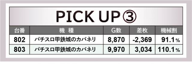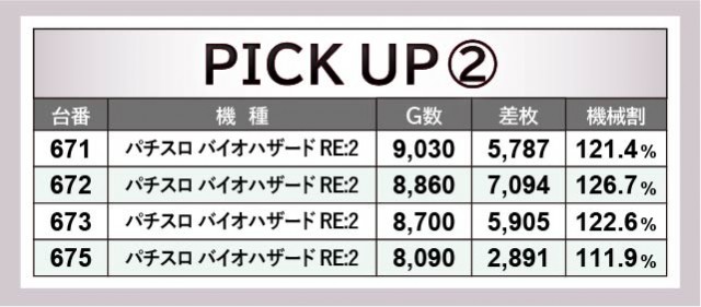『SLOTバジリスク~甲賀忍法帖~絆2』は2台の万回転OVER台が見られ、さらには4千枚OVER2台・5千枚OVER2台という圧巻のパフォーマンスを披露。『パチスロ バイオハザード RE:2』も同様で、672番台+7,094枚という活躍だけでなく、2台の5千枚OVERが発生していた。『パチスロ甲鉄城のカバネリ』もポテンシャルを感じられる内容で、大きくマイナスを記録するも、回転数から相当な手ごたえが窺えるだろう。