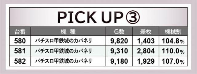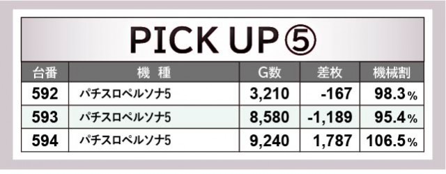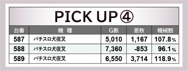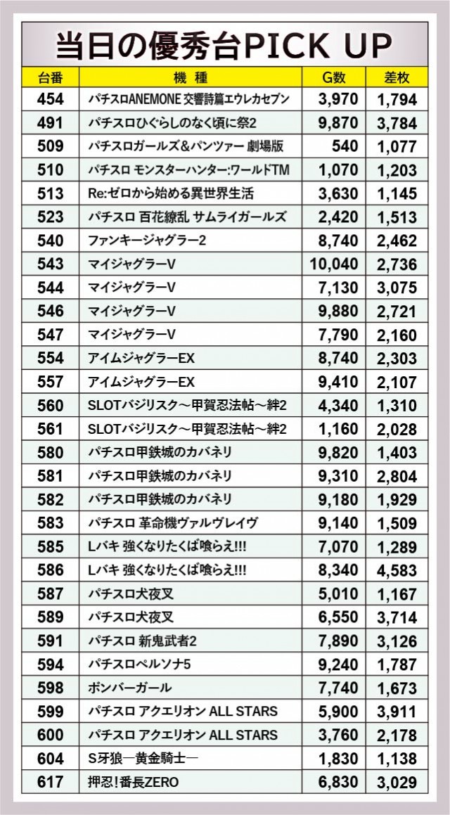 人気を博する6.5号機群からは、『パチスロ甲鉄城のカバネリ』『パチスロ犬夜叉』『パチスロペルソナ5』が先頭に立っていた。『パチスロ甲鉄城のカバネリ』は全台9千回転台をマークし、当然のようにプラス差枚を達成。『パチスロ犬夜叉』589番台+3,714枚という数字も見られ、手ごたえを感じられる状況だったのは間違いない。