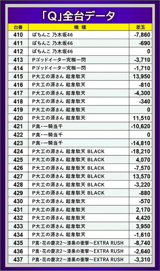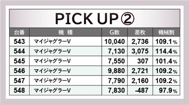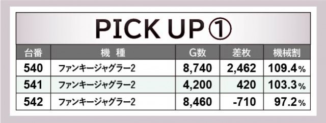 『ファンキージャグラー2』『マイジャグラーV』の両機種は、各所で粘り強く遊技されていた形跡が窺える。その中で後者は2千枚OVERが多発する状況でもあり、コンスタントなGOGOランプの輝きは、ファンに癒しをもたらしていたのではないだろうか。マイナスを記録した台の数字も僅かで、十分にポテンシャルを感じられた内容が分かる。