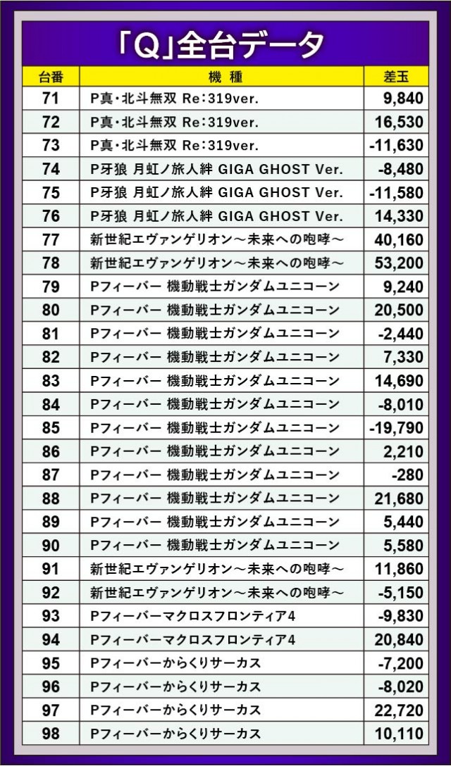 『新世紀エヴァンゲリオン〜未来への咆哮〜』77番台+40,160玉・78番台+53,200玉という記録から分かるように、凄まじい熱気を放っていたのが印象的だ。負けじと『Pフィーバー 機動戦士ガンダムユニコーン』も奮闘し、80番台+20,500玉・88番台+21,680玉という記録を残し、両機種とも人気機種たる所以を見せつけてくれた。