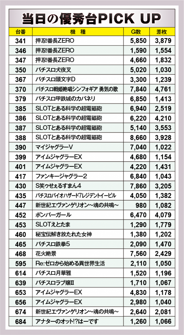 ピックアップした30台の優秀台を見れば、人気機種からバラエティまで幅広く活躍していたことが窺える。30台のうち10台が差枚数+2千枚以上を達成、さらに+3千枚以上は7台、うち+4千枚以上は3台となった。後述する好調機種以外では、370番台の『パチスロ戦姫絶唱シンフォギア勇気の歌』が+4,761枚でこの日のトップ差枚数を獲得した!さらに430番台の『S笑ゥせぇるすまん4』が+3,205枚、674番台の『新世紀エヴァンゲリオン〜魂の共鳴〜』が+2,081枚をマークした。