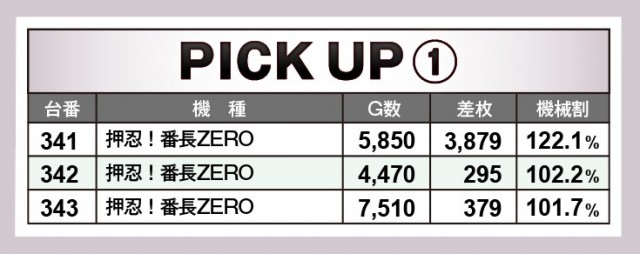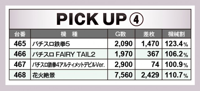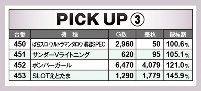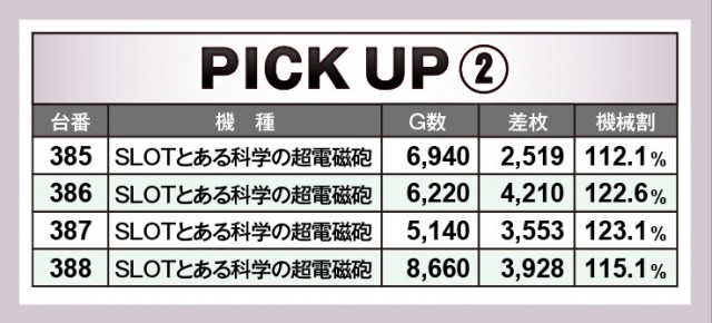 次にこの日の好調4機種に注目。まず『押忍!番長ZERO』では341番台の+3,879枚を筆頭に横並びでプラスとなった。ついで『SLOTとある科学の超電磁砲』では4台が横並びで+2千枚オーバーし、4台のトータル差枚数は+1万4千枚オーバーを獲得!さらにバラエティコーナーが盛り上がりをみせており、なかでも452番台の『ボンバーガール』が+4079枚、468番台の『花火絶景』が+2,429枚と目立っていた。いずれの機種も+2~4千枚オーバーが発生し、あらゆる機種にチャンスが眠っていたということがおわかりだろう。