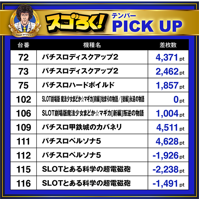 75番台の「パチスロハードボイルド」や106番台の「SLOT劇場版魔法少女まどか☆マギカ[新編]叛逆の物語」などなど、気になる台はほかにも多数。どちらもナイスな結果だったぜ★