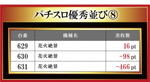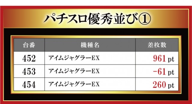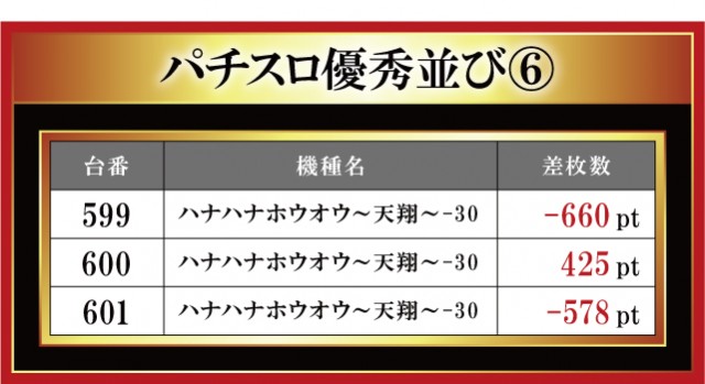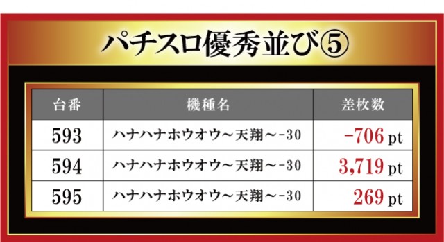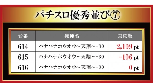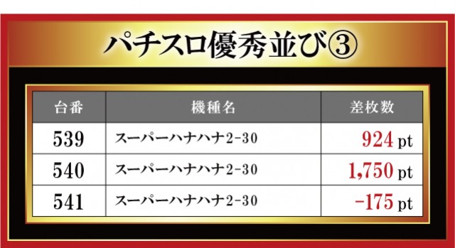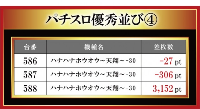 恒例となった月イチ実施の「はねバト!」。12月1日に実施された「菰野店」におけるパチスロ3台並びの優秀台をお伝えしていこう。菰野店はやはり『ハナハナホウオウ~天翔~-30』を主力に添えているのがヒシヒシと伝わってくる。なんと3台並びの箇所が4箇所もあり! ただ、その全てが結果が良かったわけではない。正直、粘られていない印象もあるので、過去の結果も踏まえてもう少し主力機種を粘り腰で打ってみてはいかがであろうか。