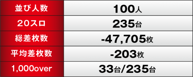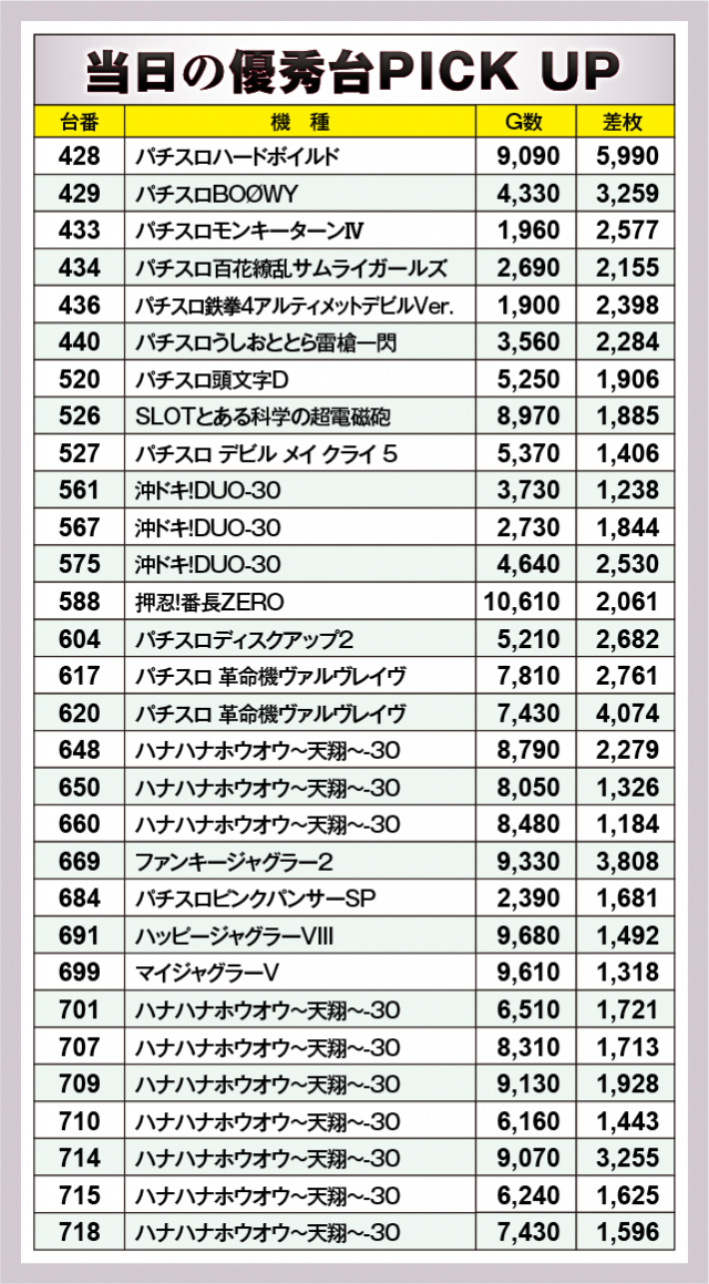 上表の通り、『押忍!番長ZERO』で万回転OVERを達成。『ハッピージャグラーVIII』『マイジャグラーV』『ファンキージャグラー2』のジャグラー3機種でも万回転に迫る勢いでゲーム数が出され、朝から閉店までじっくりと打ち込まれていた様子が窺える。また428番台の『パチスロハードボイルド』では、9000OVER回転・+5,990枚と好記録が目立っており、各所様々な機種が活躍していた。