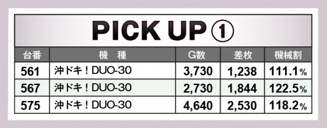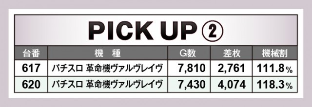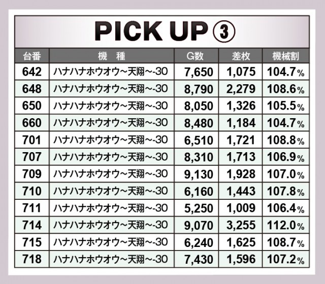 『沖ドキ!DUO-30』は575番台+2,530枚を筆頭に3台トータル差枚数は+5,000枚OVERを獲得!また注目の新台の620番台『パチスロ 革命機ヴァルヴレイヴ』で+4,074枚を記録し、遊技するファンから笑みがこぼれおちていたに違いない。そして、お決まりの『ハナハナホウオウ~天翔~-30』では、横並びを含む12台が+1千枚OVERを獲得し、トータル差枚数は+20,000枚OVERという記録が鮮烈だ。ハイビスカスの輝く光景が容易に想像でき、多くのファンが手ごたえを感じてレバーを叩いていたはずだ。