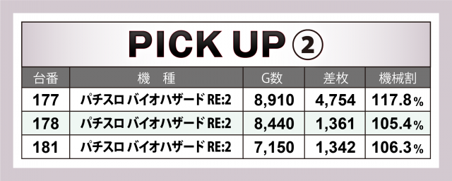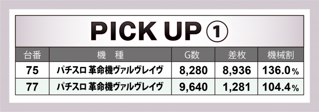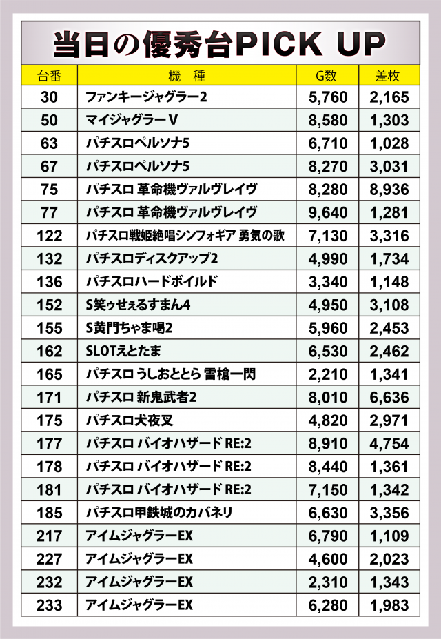 続いては好調3機種9台をチェック。何と言っても注目は導入直後のスマスロ1号機『パチスロ 革命機ヴァルヴレイヴ』で、75番台は+9千枚に迫る勢いに。また『パチスロ バイオハザード RE:2』では+5千枚弱の台を輩出、『アイムジャグラーEX』は4台トータルで+6千枚を突破した。