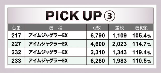 今回、[1,000円/46枚]スロ161台のトータル差枚数は+6,612枚で終えられたが、今回を含め直近3回では4桁のプラスに終わっており、過去回の実績を考慮すれば出玉ポテンシャルはまだまだあるはず。また1,000overは全体の2割弱と前回より下がった点は残念の一言。「英雄」取材ではこの一年で11連勝を達成しているが、取材班が驚くような差枚数での勝利を拝みたいものだ。
