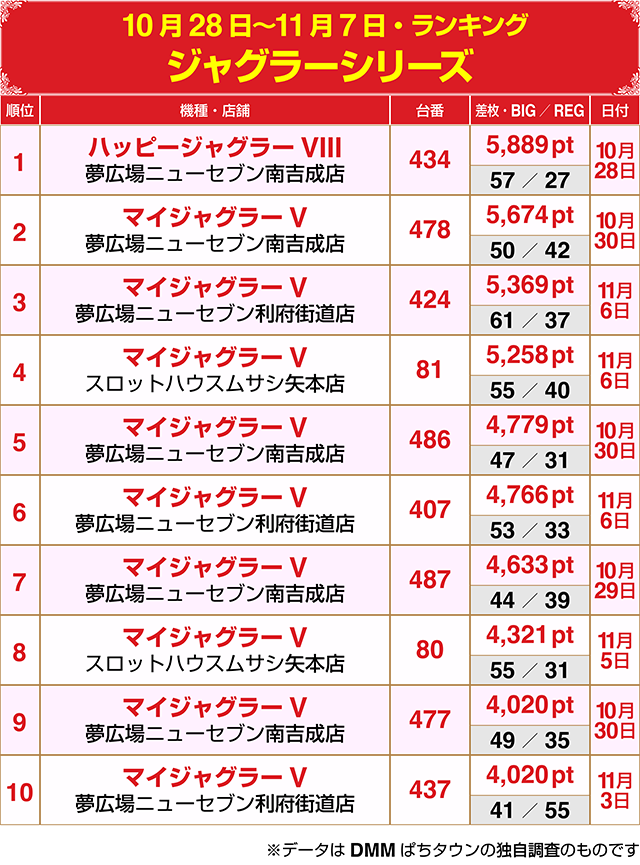 『ハッピージャグラーVIII』もランクインしており、じっくりと遊技を楽しむプレイヤーの活躍が光った。
