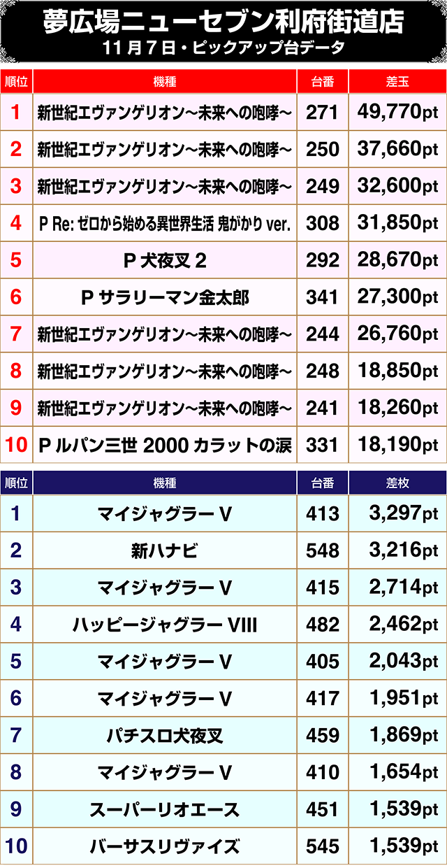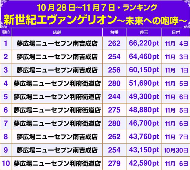 地域最大級の設置台数を誇る『新世紀エヴァンゲリオン~未来への咆哮~』の支持率は高く、10台以上が+40,000ptを超えた。