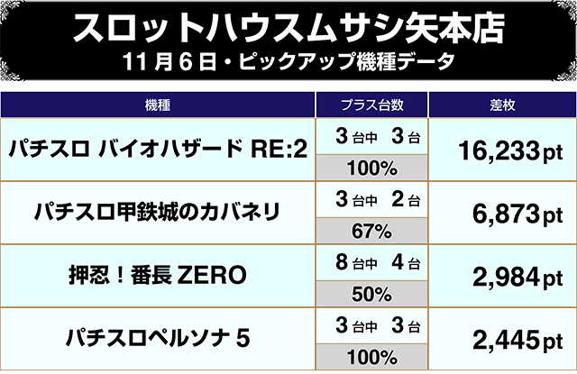 『パチスロペルソナ5』も3台のすべてがプラス、『パチスロ甲鉄城のカバネリ』は+6,000ptオーバーと、3台設置の6.5号機が目立った。