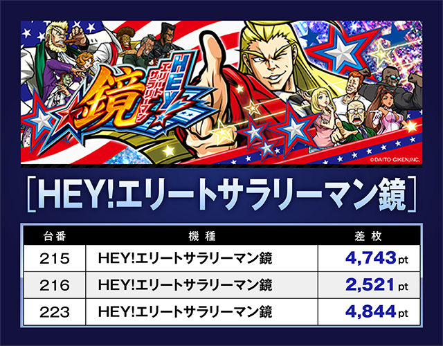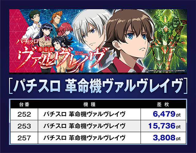223番台の「HEY!エリートサラリーマン鏡」や253番台の「パチスロ 革命機ヴァルヴレイヴ」を優秀台としてチョイス!