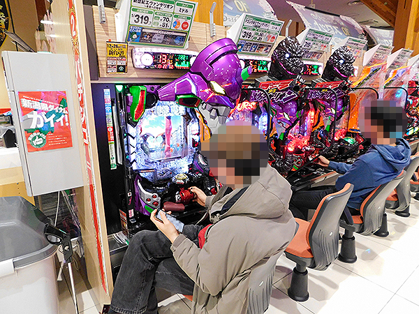 14時ごろの200円/89玉パチンコでは「新世紀エヴァンゲリオン〜未来への咆哮〜」や「Pゴジラ対エヴァンゲリオン〜G細胞覚醒〜」、「Pフィーバー 機動戦士ガンダムユニコーン」が好評を得ており、プレイヤーの満足そうな表情を様々な場面で目にしている。