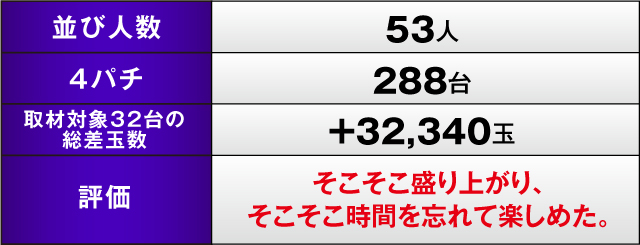一方で『P真・牙狼2』は全台マイナスという結果に。数字こそ芳しくないないが、力強くハンドルを握りしめる光景が見られたことから、有意義な時間を過ごしていたのだと窺える。