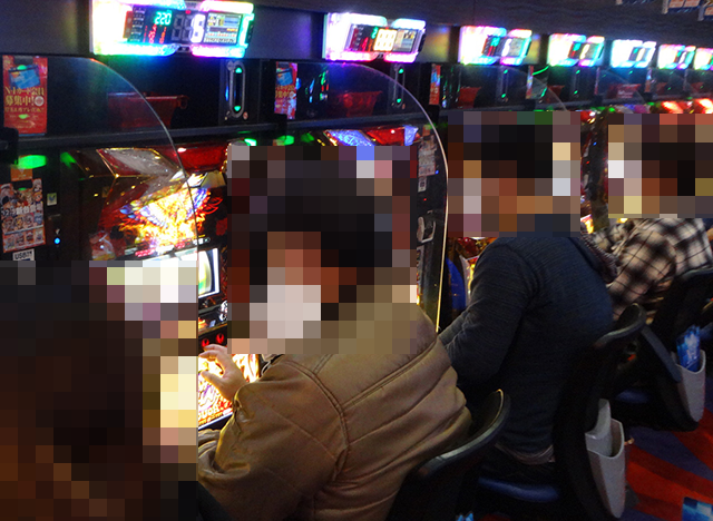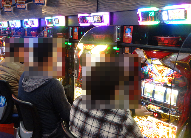 14時半頃の「ハナハナホウオウ~天翔~-30」は、7割以上の台が埋まるほどに人気。