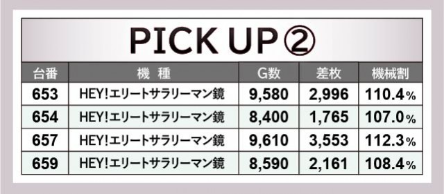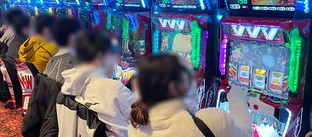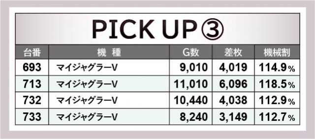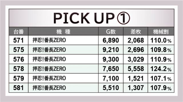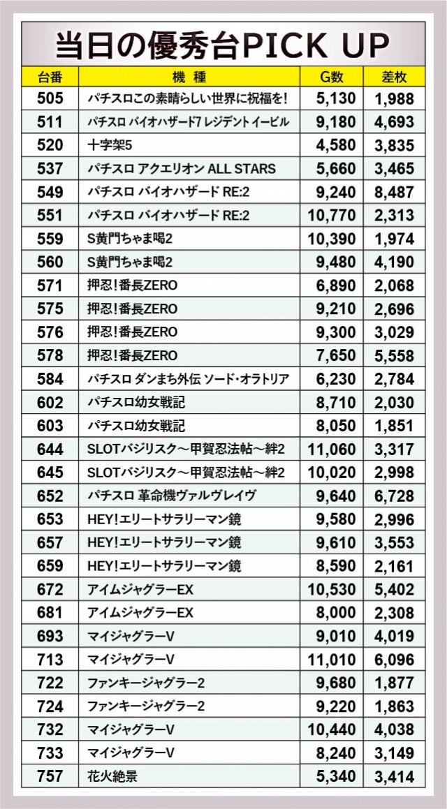 6.5号機やスマスロが続々と登場するなか、『押忍!番長ZERO』が存在感を放っていた。578番台+5,558枚を筆頭に、576番台+3,029枚が発生するなどの盛り上がりを披露。一方でスマスロ『HEY!エリートサラリーマン鏡』657番台+3,553枚という数字も見られ、導入されて早々から活躍している。もちろんお馴染みの『マイジャグラーV』も713番台11,010G・+6,096枚という記録が生まれており、これらを遊技していたファンは有意義な時間を過ごしていたことだろう。