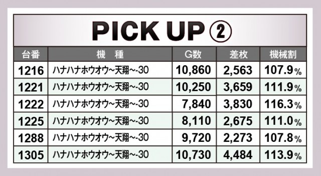 続いてはこの日の好況スポット3箇所に注目。まずは横並びで優秀だった『パチスロ革命機ヴァルヴレイヴ』で、この日のトップ差枚数+10,289枚を筆頭に3台トータル差枚数は+1万9千枚オーバーを叩き出した。次に『ハナハナホウオウ~天翔~-30』では、ピックアップ6台のトータル差枚数は+1万9千枚オーバー、3台が万回転を記録した。そして不動の人気機種『押忍!番長ZERO』でも、ピックアップ6台全てが万回転を記録し、トータル差枚数は+2万9千枚オーバーと遊技するファンは確信をもってレバーを叩いていたことが窺える。
