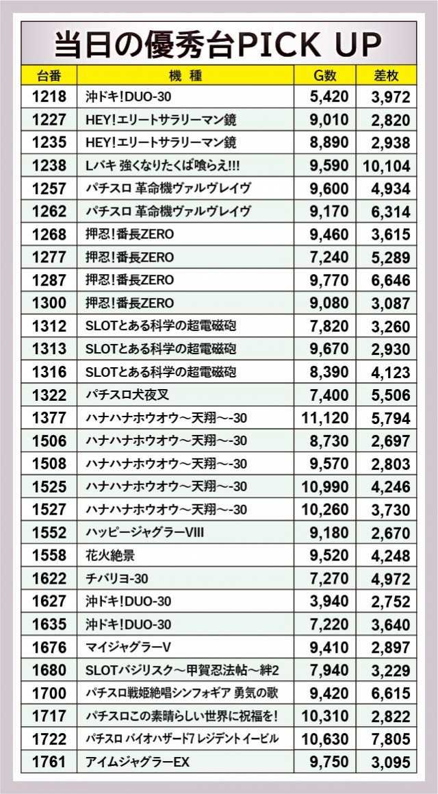 『Lバキ 強くなりたくば喰らえ!!!』1238番台+10,104枚が発生。他にも『パチスロ 革命機ヴァルヴレイヴ』1262番台+6,314枚・『押忍!番長ZERO』1287番台+6,646枚・『パチスロ戦姫絶唱シンフォギア 勇気の歌』1700番台+6,615枚・『パチスロ バイオハザード7 レジデント イービル』1722番台+7,805枚など、凄まじい熱気が各所で放たれていた。万回転OVERも当然のように見られ、上表から活気と熱気がともに最高のものであったことが窺えるだろう。