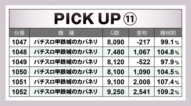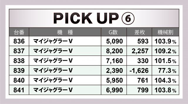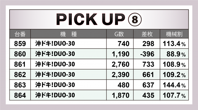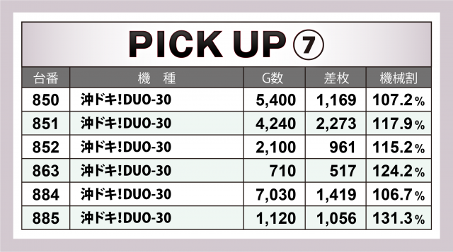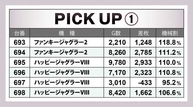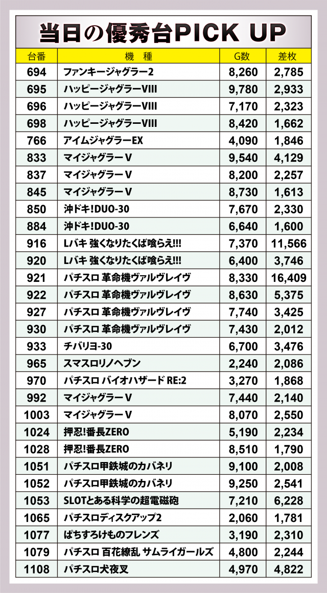 続いては横並び好況スポット7機種66台をチェック。『ファンキージャグラー2』『ハッピージャグラーVIII』『マイジャグラーⅤ』『チバリヨ-30』『パチスロ甲鉄城のカバネリ』で、+3千枚・+2千枚超の台が連発。一方、『アイムジャグラーEX』『沖ドキ!DUO-30』は対象台数が多めだったものの、あまり際立った台がなかったのが少々残念だった。