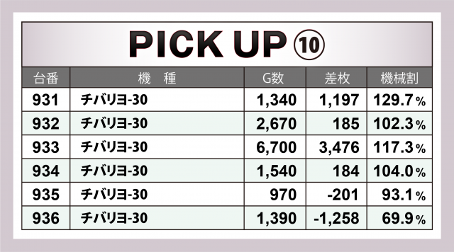 まずは優秀30台のPICK UPから。30台のうち23台が差枚数+2千枚以上を達成、+3千枚以上は9台、+4千枚オーバーは6台、+5千枚オーバーは4台となった。後述する横並び好況スポット以外では、なんと言ってもスマスロ2機種がビッグヒットをかっ飛ばした。『パチスロ 革命機ヴァルヴレイヴ』では+1万6千枚オーバー台を筆頭に4台トータルで+2万7千枚超を達成、『Lバキ 強くなりたくば喰らえ!!!』は+1万1千枚オーバー台をトップに2台合計で+1万5千枚を突破という結果に。その他の機種では+6千枚をクリアした『SLOTとある科学の超電磁砲』、+4千枚を超えた『パチスロ犬夜叉』がキラリと光る成績を残した。