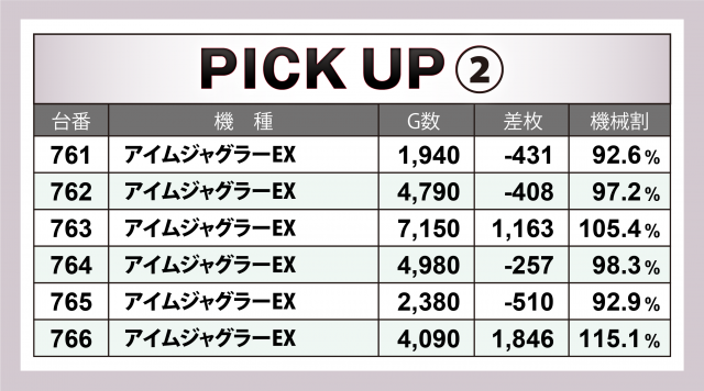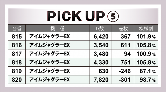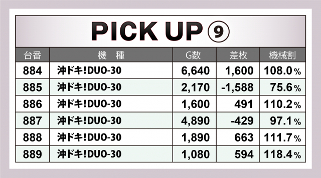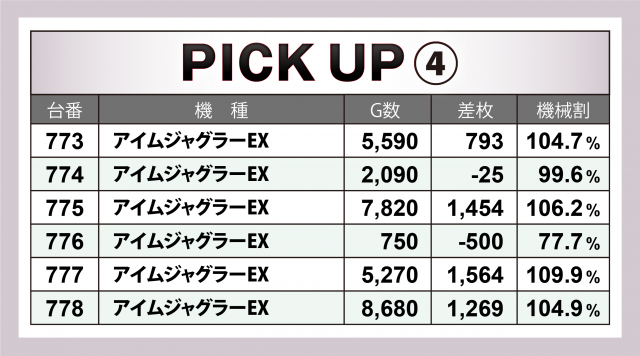 今回、[1000円/46枚] スロ全354台のトータル差枚数は+15,930枚となり、前回のトータルマイナスにキッチリとリベンジ。一方、1,000overは前回と同じ台数となり、もうひと伸びが欲しかった。とは言え、連敗とならなかった点は一安心。今までの戦績を振り返れば地力の高さは折り紙つきのため、次回は今回の成績を弾みにより高みを目指してもらいたい。