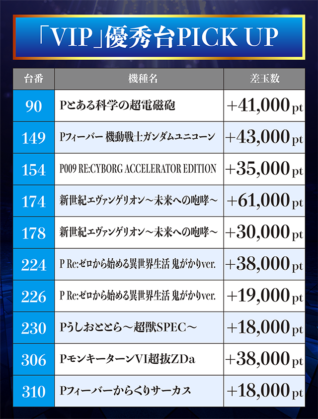 306番台の「PモンキーターンVI超抜ZDa」は+38,000pt、もはや定番機種ともいえる「Pフィーバー 機動戦士ガンダムユニコーン」でも+40,000pt超の台を確認している。