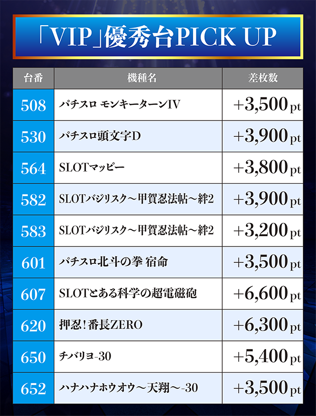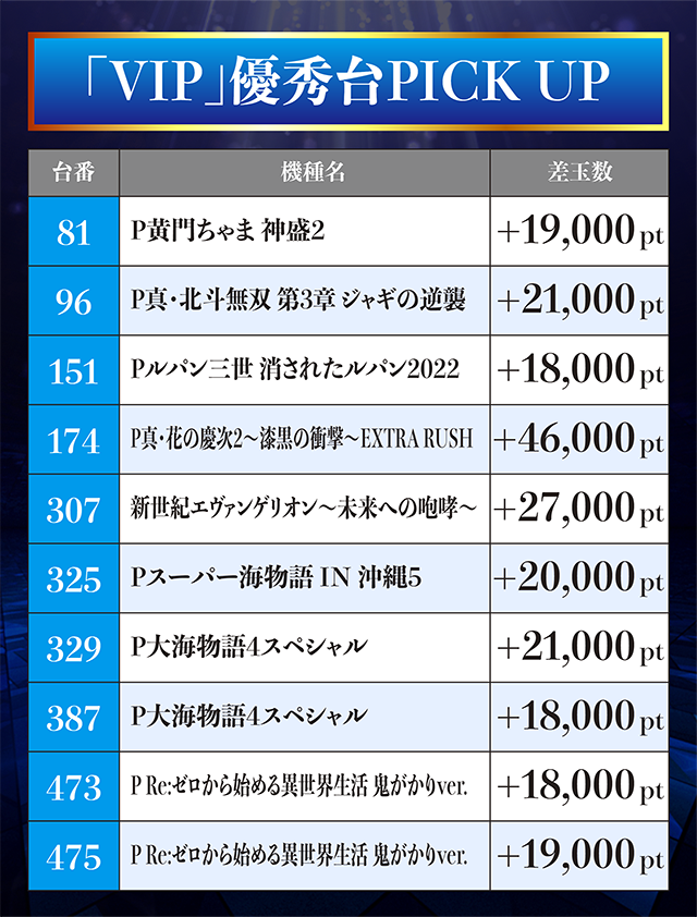 「P真・北斗無双 第3章 ジャギの逆襲」にも注目の台が複数あり、96番台は+21,000pt、180番台は+11,000ptとなった。