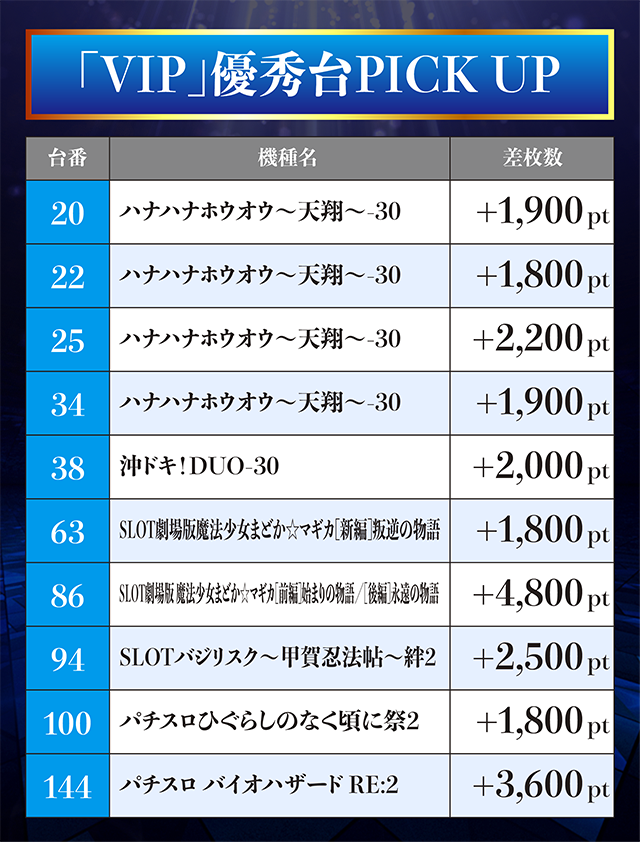 「沖ドキ!DUO-30」の38番台や「SLOTバジリスク~甲賀忍法帖~絆2」の94番台なども+2,000pt以上を記録した。