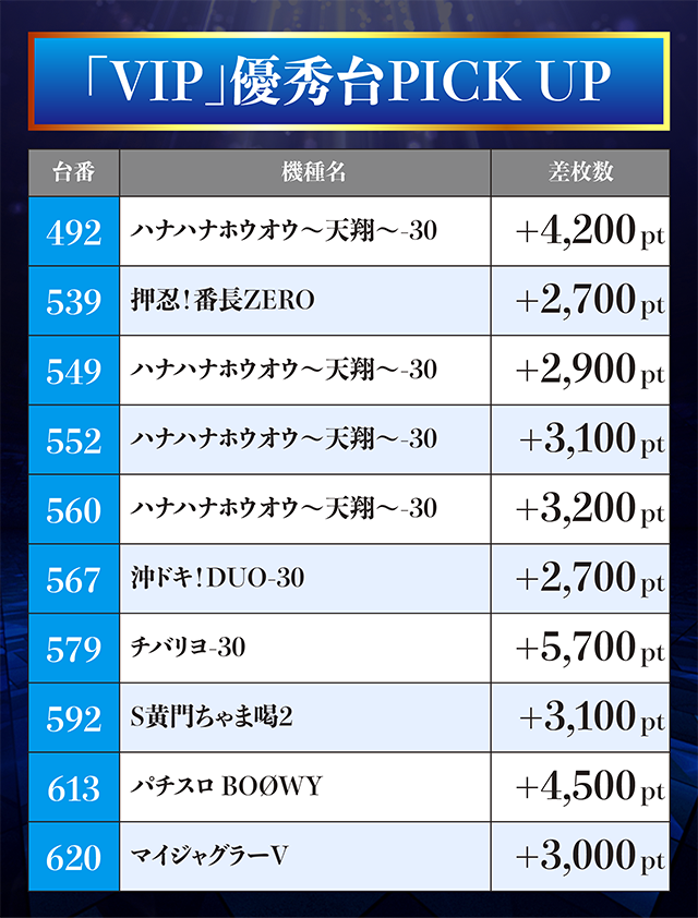 「チバリヨ-30」の579番台は+5,700pt、「パチスロ BOØWY」の613番台は+4,500ptを記録した。