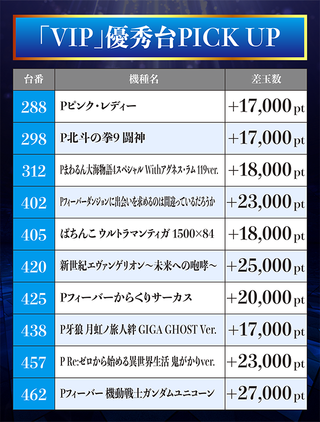 462番台の「Pフィーバー 機動戦士ガンダムユニコーン」も+27,000ptと、プレイヤーの活躍が際立つ。