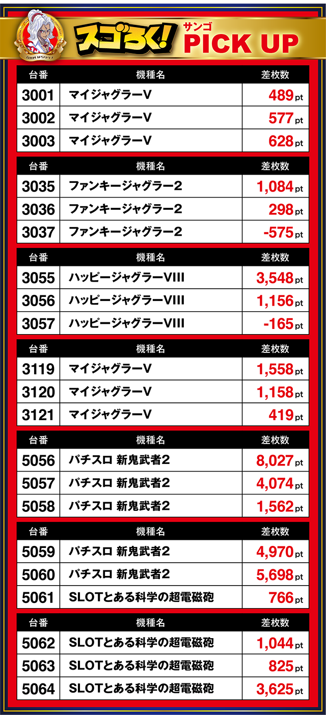 オレが厳選したこの9台の結果は、すべてプラス。5056番台は、8,000pt以上と好記録をマークしていたな。