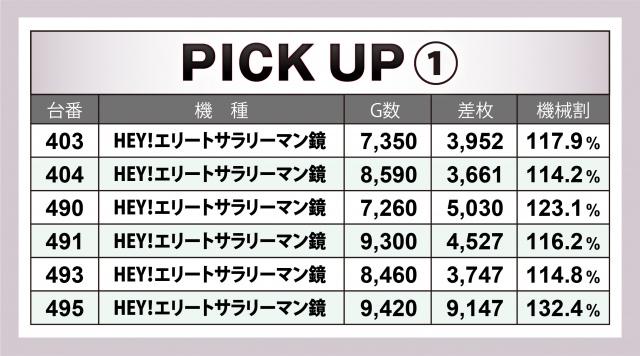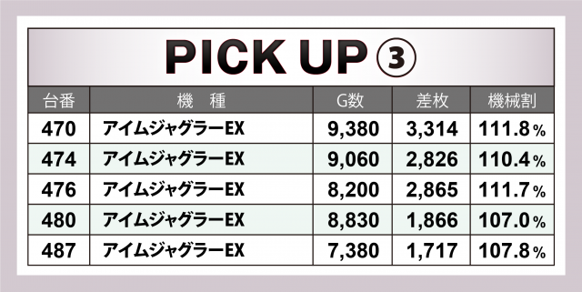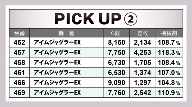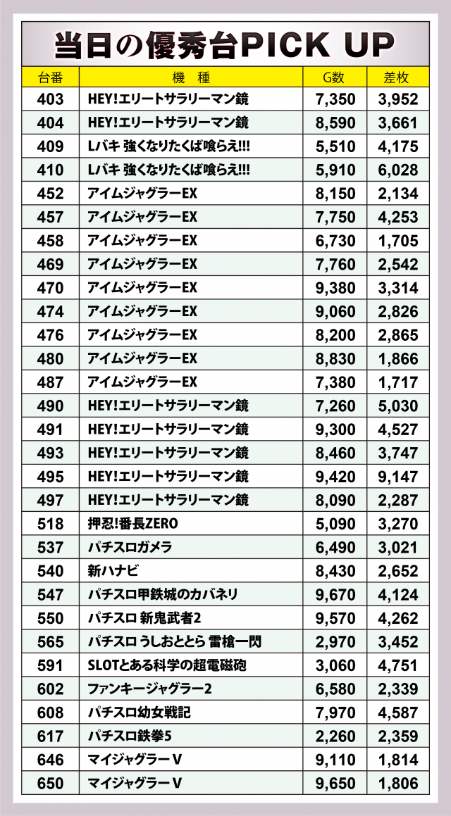 続いては当日好調だった2機種16台について。まずは6台の平均が+5千枚を超えた『HEY!エリートサラリーマン鏡』から。トップは+9千枚突破台をマーク! さらに前回と同じく11台全てが4桁プラス&最優秀台は+4千枚オーバーを記録した『アイムジャグラーEX』の好成績が光った。