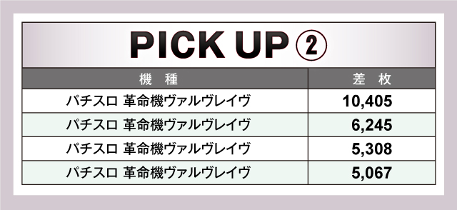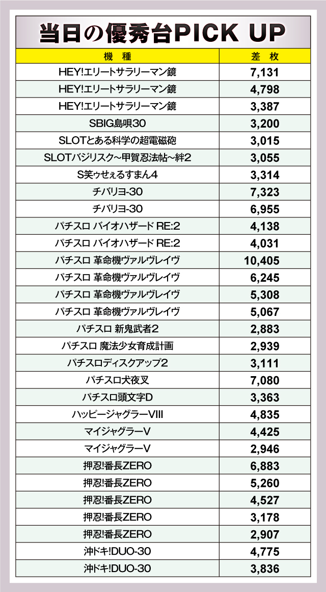 ホール登場以来、全国のホールでその実力披露しているスマスロ『パチスロ 革命機ヴァルヴレイヴ』が、ここでもポテンシャルを発揮した。+10,405枚という、大台越えの一台を筆頭に、+6,245枚、+5,308枚、+5,067枚と優秀台がズラリ。しばらくこの勢いは止まりそうにない。それに続いたのが『チバリヨ-30』。+7,323枚、+6,955枚と、2台揃って大活躍を見せた。こちらも、まだまだ人気は続きそうだ。『HEY!エリートサラリーマン鏡』も負けてはいない。こちらも最新のスマスロだが、+7,131枚をマークする台がでるなど、大いに賑わっていた。その他では、+7,080枚の『パチスロ犬夜叉』、+6,883枚の『押忍!番長ZERO』、+4,835枚の『ハッピージャグラーⅧ』、+4,775枚の『沖ドキ!DUO-30』などが目立っていた。
