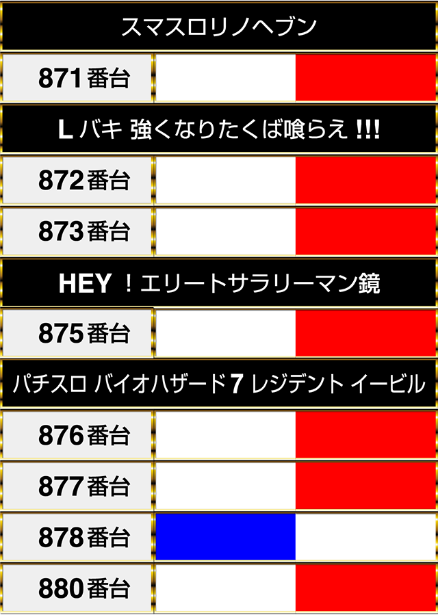 871番台の『スマスロリノヘブン』から877番台の『パチスロ バイオハザード7 レジデント イービル』までの6台が並んでプラスptを記録。