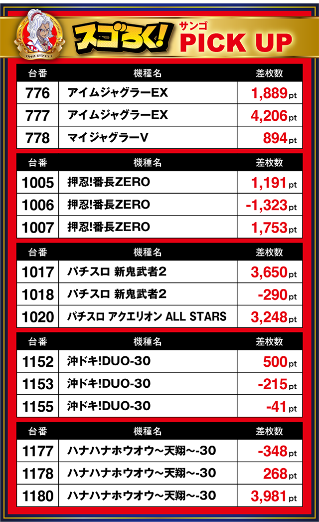 プラスでこの日を終えたのは2台で、4,000ptに到達しそうな台もあったよ。