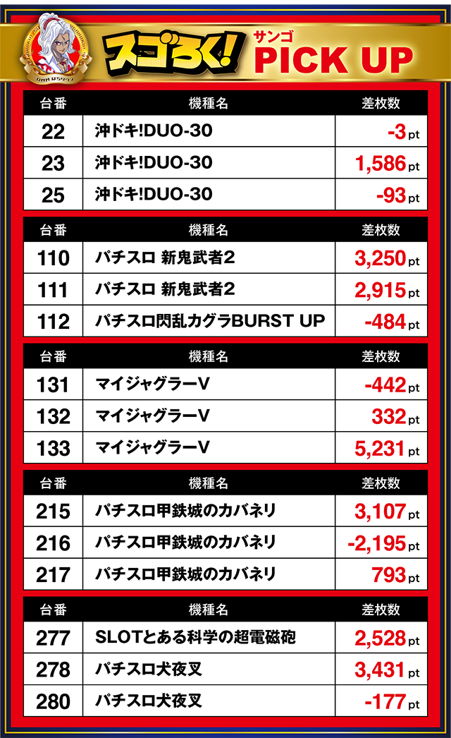 オレが気になった台の結果をみると、215番台が3,000ptオーバー!