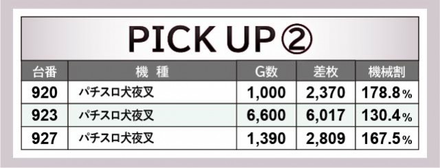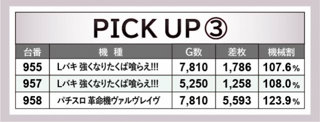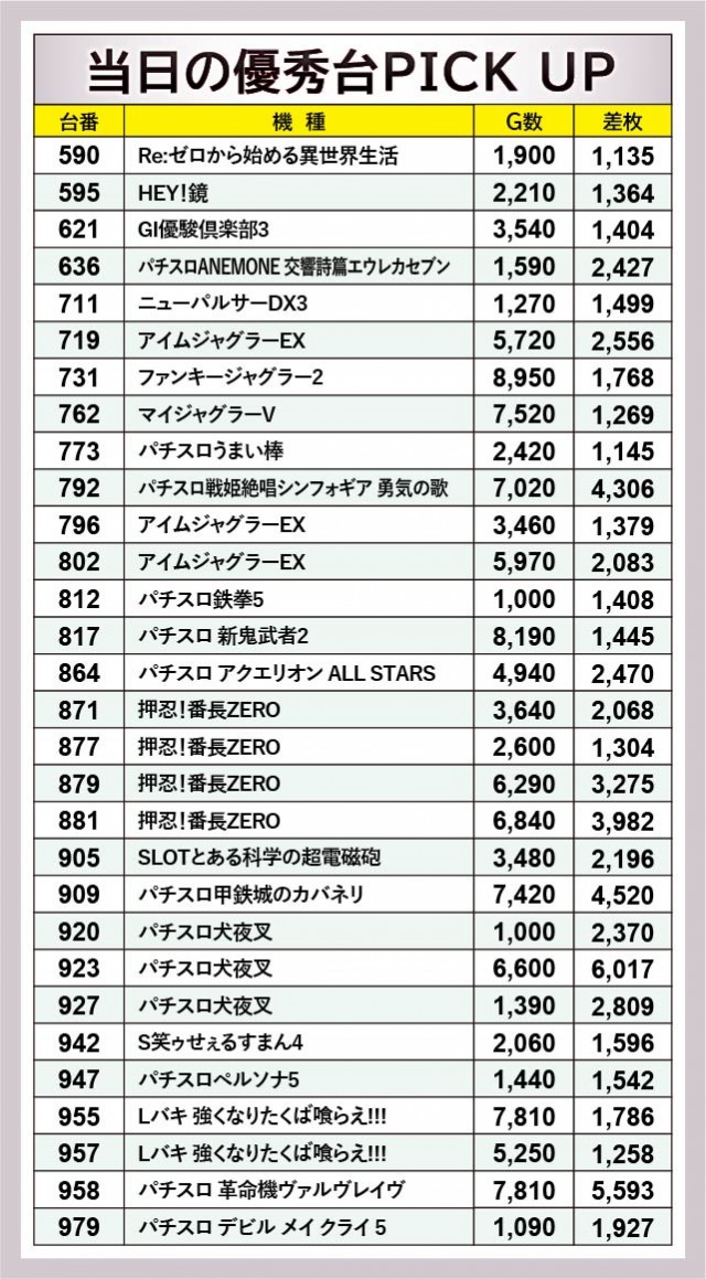変わらぬ人気を維持する『押忍!番長ZERO』では、2台の3千枚OVERが発生。また『パチスロ犬夜叉』923番台+6,017枚という盛り上がりも見られ、既存のAT機群の活躍は大きいと言えるだろう。その一方で新時代を担う『Lバキ 強くなりたくば喰らえ!!!』『パチスロ 革命機ヴァルヴレイヴ』も奮闘。特に後者は958番台+5,593枚という記録を残しており、遊技するファンに存在感を見せつけていた。