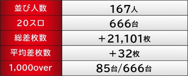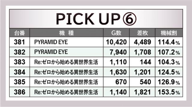 『PYRAMID EYE』は381番台10,420G・+4,489枚という見事な右肩上がりのグラフを描き、明らかな手ごたえを感じていた様子が窺える。その一方で『Re:ゼロから始める異世界生活』はゲーム数こそ不足しているが、383~386番台の4台がしっかりとプラス差枚を達成。後者はよりゲーム数が消化されていれば、もっと大きな記録となっていた可能性があっただけに、唯一残念なポイントなのかもしれない。