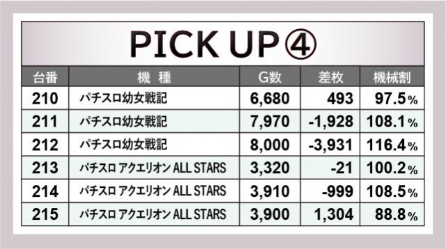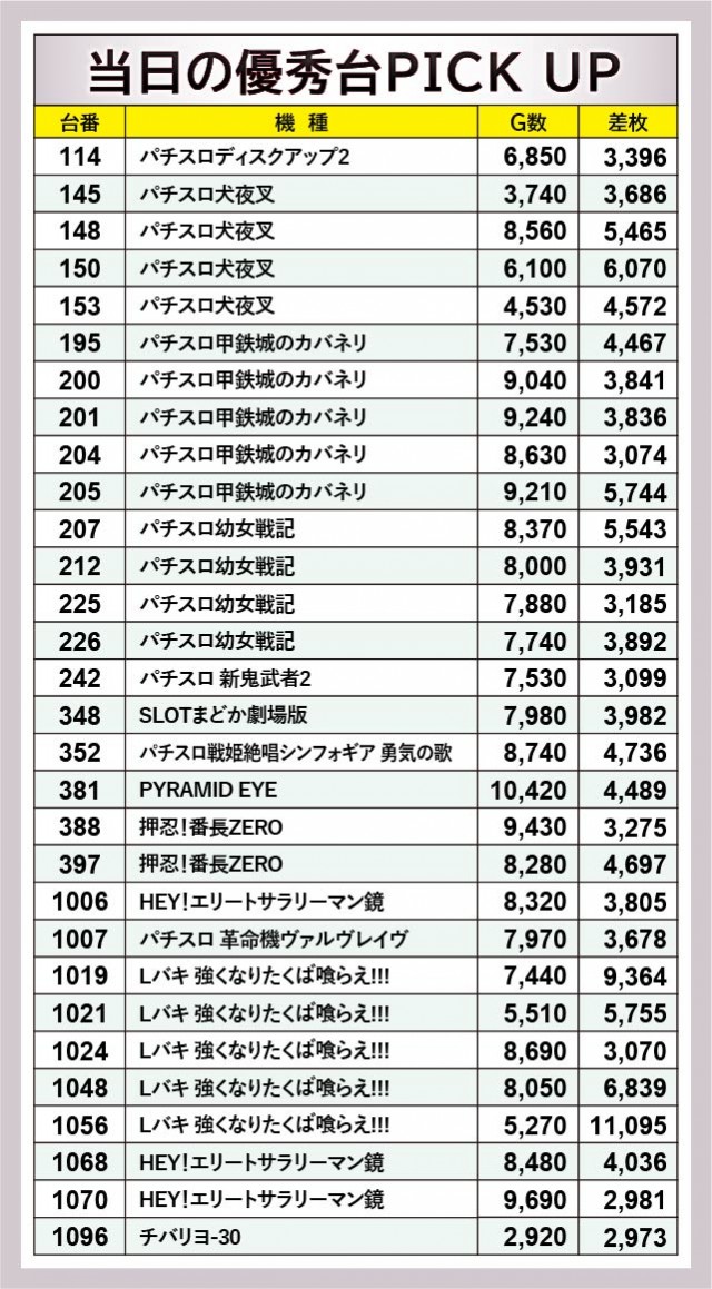 優秀台をピックアップしてみると、機種単位での活躍が大きく目立った内容となっている。導入されたばかりの『パチスロ幼女戦記』や、増台された『パチスロ甲鉄城のカバネリ』、さらに他機種においても8~9千回転OVERが珍しくない。差枚数を見ても、スマスロ『Lバキ 強くなりたくば喰らえ!!!』から1019番台+9,364枚・1056番台+11,095枚という大記録が発生。他にも5~6千枚OVERを確認でき、活気と熱気に満ちていたと言える。