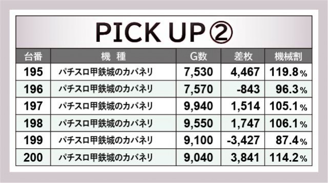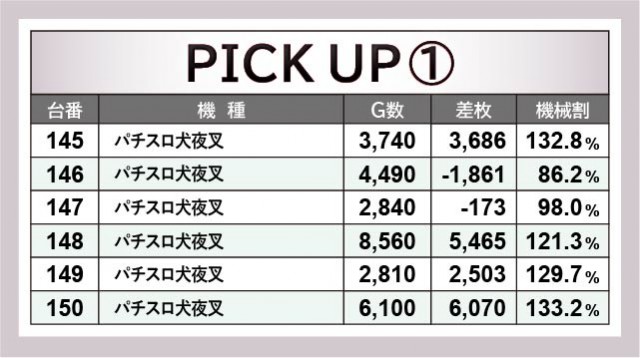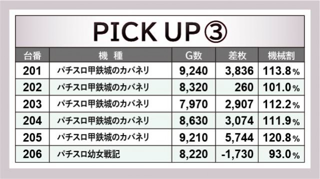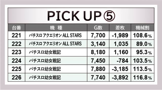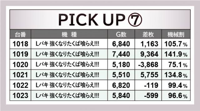 6.5号機群から凄まじいほどの活気と熱気が放たれていた。『パチスロ犬夜叉』150番台+6,070枚や『パチスロ甲鉄城のカバネリ』205番台+5,744枚といった、充実の内容が見られる。『パチスロ幼女戦記』『パチスロ アクエリオン ALL STARS』も活気こそ見られたが、差枚数が伴わなかった展開となっている。ポテンシャルを感じられたのは間違いなく、それは遊技していたファンが良く分かっていることだろう。
