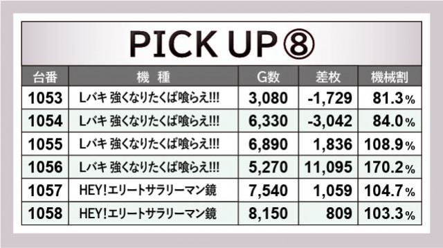 パチスロ新時代・スマスロの好調さも見逃してはならない。増台された『Lバキ 強くなりたくば喰らえ!!!』から1019番台+9,364枚・1056番台+11,095枚という大記録が発生すれば、まだ導入されて日が浅い『HEY!エリートサラリーマン鏡』もポテンシャルを放っていた。後者は大きな差枚数こそ見られないものの、しっかりとプラス差枚を記録しているあたりから、打ちごたえがあると感じたファンは多いはずだ。