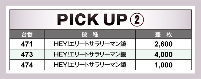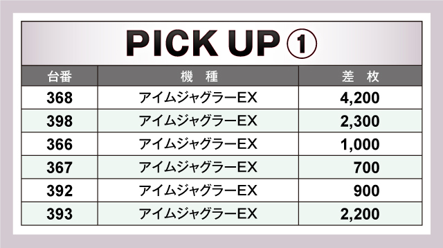 そんな中でも特に注目したいのが、『アイムジャグラーEX』と『HEY!エリートサラリーマン鏡』だ。多くの台で好成績を残し、特にホール内でも目立つ存在となっていた。