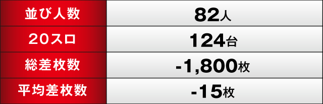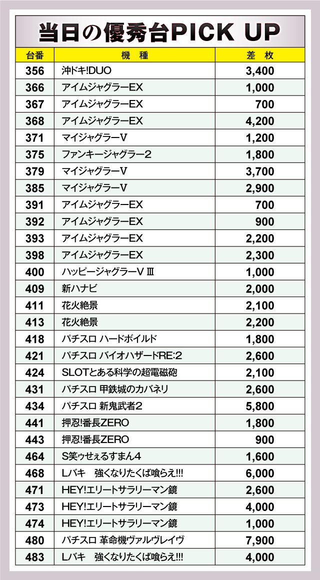 当日のホール内では様々な機種が大活躍していたが、スマスロの『Lバキ 強くなりたくば喰らえ!!!』が+6,000枚、『パチスロ 革命機ヴァルヴレイヴ』が+7,900枚と、素晴らしい成績を残した。また、Aタイプの『ジャグラーシリーズ』も同じく多くの英雄たちの笑顔を生み出していた。