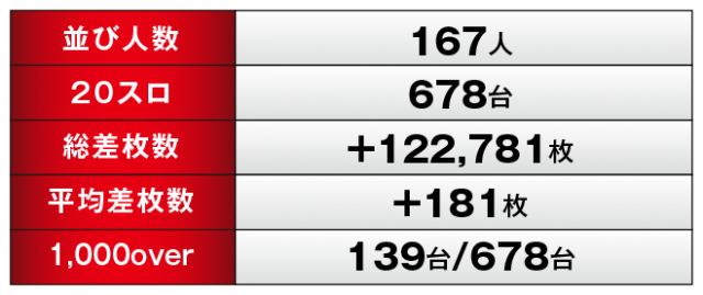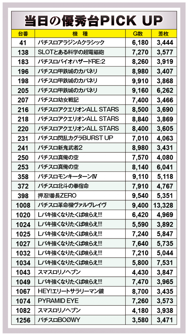 まずは優秀30台のPICK UPから。なんと30台全てが差枚数+3千枚以上を達成!+4千枚以上が13台、うち+5千枚以上は9台となった。後述する好調4機種以外では、この日のトップ差枚数に輝いた1008番台の『パチスロ革命機ヴァルヴレイヴ』で+13,328枚を獲得!次いで253番台の『パチスロ真俺の空』で+6,041枚、さらに358番台の『パチスロモンキーターンⅣ』で+5,118枚を獲得し、そのほか様々な機種が各所で賑わいをみせていた。