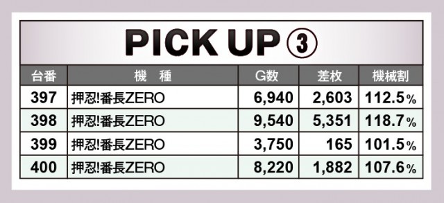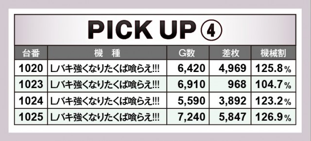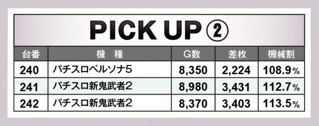 続いては横並びを含む好調機種について。なんと言っても注目するのは、『パチスロ甲鉄城のカバネリ』が設置全12台全てがプラス差枚を記録し、うち9台が差枚数+2千枚オーバー!トータル差枚数は+3万2千枚オーバーとなり、人気機種の実力を存分に見せつけていた。次いで、240番台の『パチスロペルソナ5』から241・242番台の『パチスロ新鬼武者2』や『押忍!番長ZERO』では横並びで賑わっており、ポテンシャルの高さが存分に窺えた。そしてスマートスロット機から『Lバキ強くなりたくば喰らえ!!!』がピックアップ4台のトータル差枚数+1万5千枚オーバーを記録した!