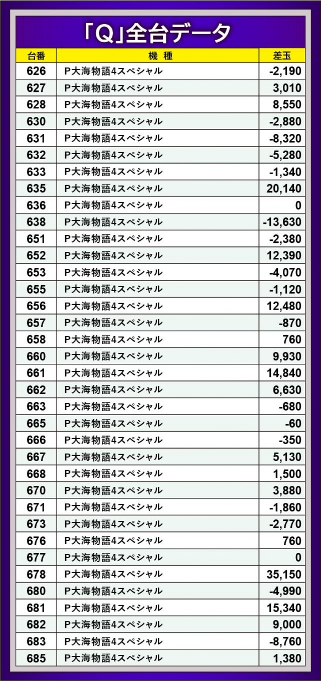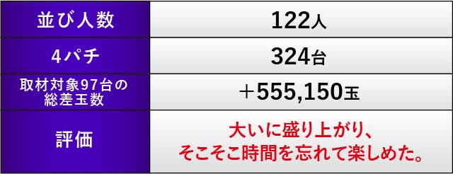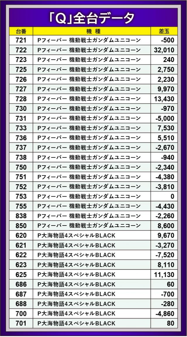 一方で既存の機種からは、『Pフィーバー 機動戦士ガンダムユニコーン』が今なお最前線で活躍する姿が印象的だった。722番台+32,010玉という記録を確認でき、まだまだファンに愛されている様子から、要注目の機種と言えるかもしれない。また『P大海物語4スペシャルBLACK』『P大海物語4スペシャル』でも万発OVERが多発、中には678番台+35,150玉という数字が見られ、王道機種も心から楽しめる環境が整っていた。