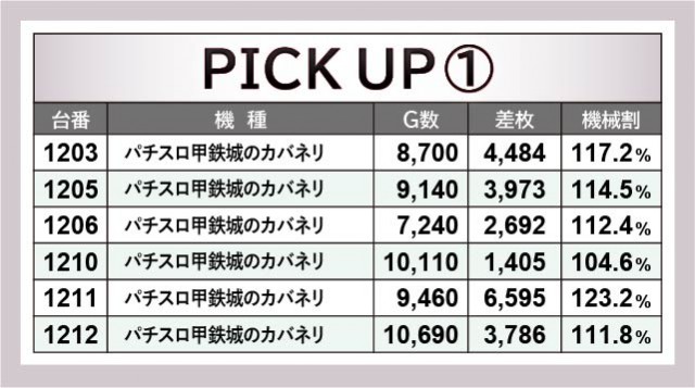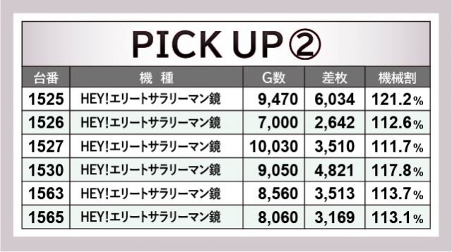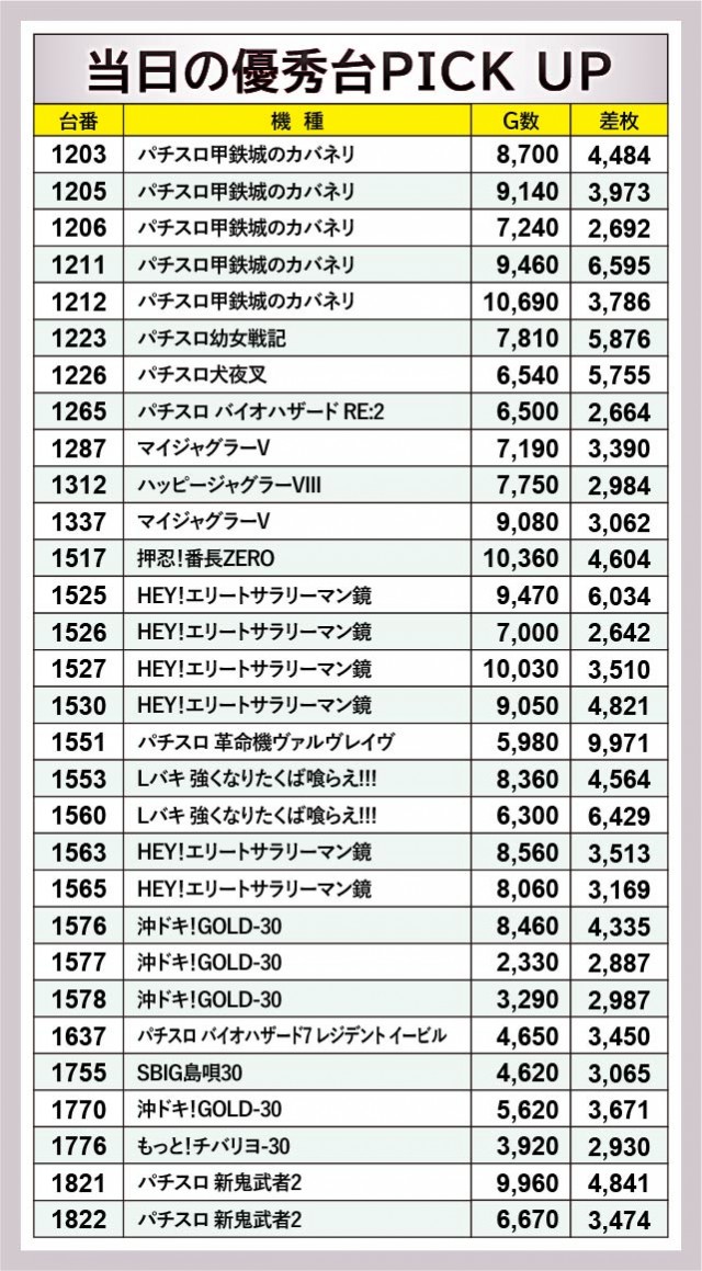 上表のピックアップされた優秀台には、人気AT機の名前がズラリと並んでいる。その中で突出した結果を残したのがスマスロ『パチスロ 革命機ヴァルヴレイヴ』1551番台+9,971枚で、あわや万枚到達という熱気を放っていた。また他にも『パチスロ甲鉄城のカバネリ』1211番台+6,595枚・『HEY!エリートサラリーマン鏡』1525番台+6,034枚・『Lバキ 強くなりたくば喰らえ!!!』1560番台+6,429枚という記録も確認でき、各所で放たれた熱気や活気は、冬の寒さを吹き飛ばしていたのは間違いないだろう。