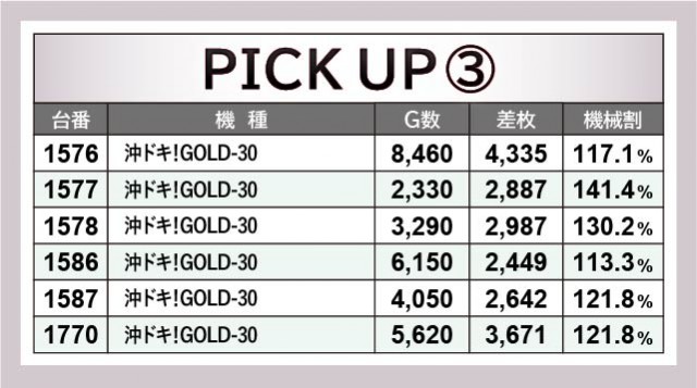 『パチスロ甲鉄城のカバネリ』『HEY!エリートサラリーマン鏡』では3~4千枚OVERがコンスタントに発生しており、打ちごたえのある状況はファンに笑顔をもたらしていたことだろう。一方で『沖ドキ!GOLD-30』からはコンスタントなハイビスカスの輝きが見られ、満面の笑みを浮かべるファンを確認できたのが印象的だった。1576番台+4,335枚といった記録も生まれており、レバーを叩く楽しさを感じていたに違いない。