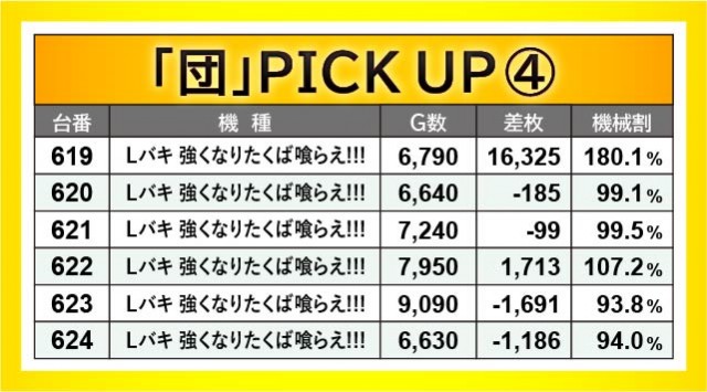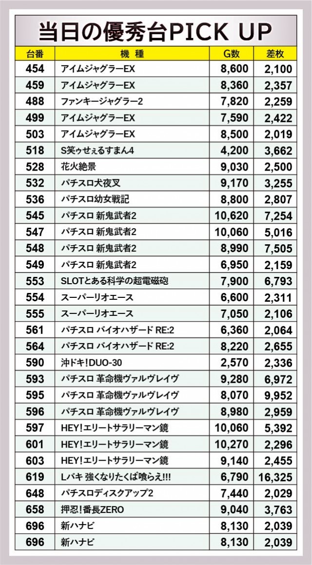 やはりファンの関心はスマスロに集まっていた。そのこともあってか、『パチスロ 革命機ヴァルヴレイヴ』595番台+9,952枚や『Lバキ 強くなりたくば喰らえ!!!』619番台+16,325枚など、凄まじい熱気が放たれていたのが鮮烈であるばかり。『HEY!エリートサラリーマン鏡』では2台の万回転OVERが発生するなど、スマスロのポテンシャルからは目が離せそうにない。