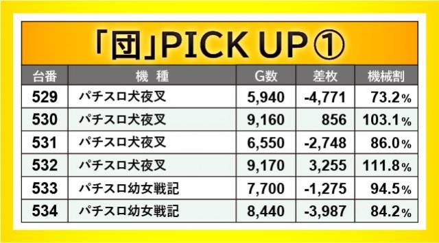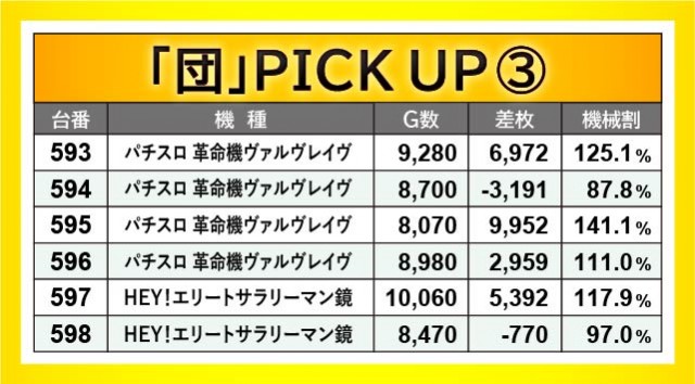 スマスロへと焦点を戻すと、『パチスロ 革命機ヴァルヴレイヴ』『Lバキ 強くなりたくば喰らえ!!!』『HEY!エリートサラリーマン鏡』のいずれもが、朝からしっかりと打ち込まれている。万枚OVERに目を奪われがちではあるが、593番台+6,972枚や597番台+5,392枚といった記録も発生。こちらでも6台横並び好況スポットが確認できているため、まとまった熱気に胸を熱くしたファンも少なくないはずだ。